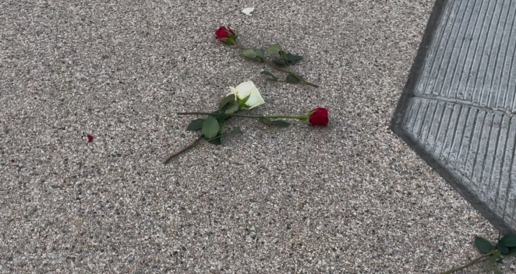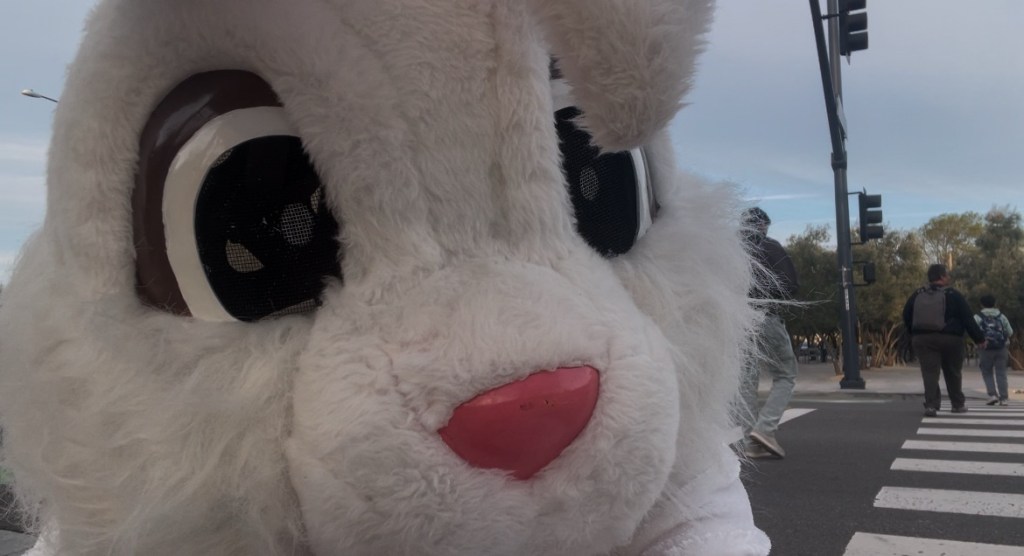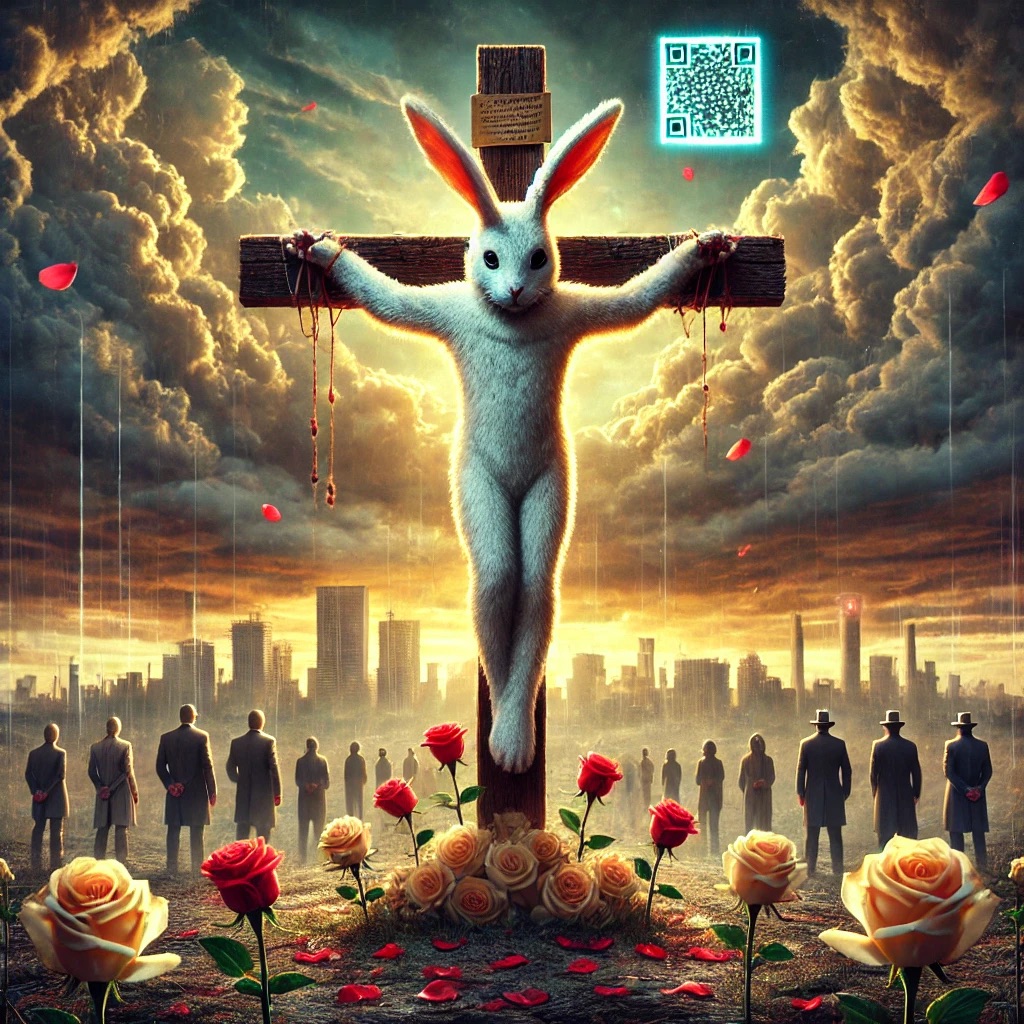 The teacher in the rabbit mask stands outside your walls, holding a sign, offering roses to the dead.